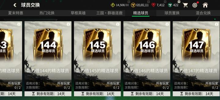 本期精选交换卡池依旧分为143-147,每个能力值的球员限量交换2次。147能力值德罗巴、范德萨、维埃拉;146能力值布兰科、罗纳尔迪尼奥、罗纳尔多;145能力值加克波、哈兰德等众多球星在列,热门球员等你来拿!