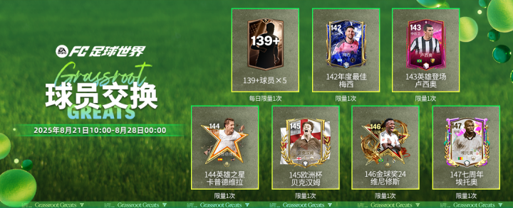 进入超级联赛,可解锁143草根英雄球员卡交换,限量1次;