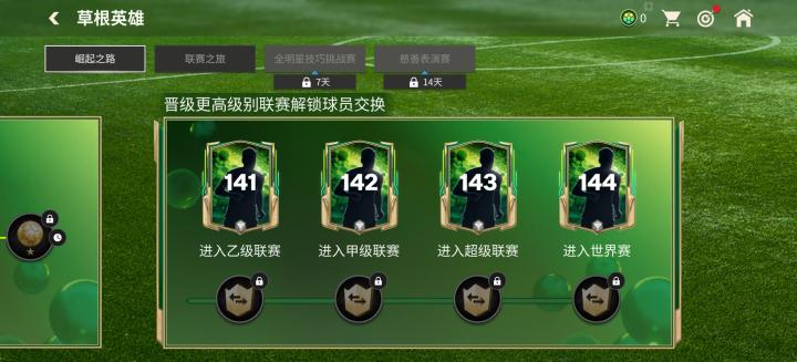 进入乙级联赛,可解锁141草根英雄球员卡交换,限量2次;