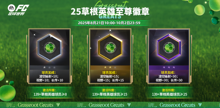 草根英雄至尊徽章本周上线。本次活动徽章分为三个星级。玩家需收集能力值139及以上的草根英雄球员,达到徽章激活所需的数量即可解锁新徽章,继续收集球员解锁更高星级的加成。草根英雄至尊徽章佩戴后,可提升全体球员的凌空抽射、视野、长传三项数据。