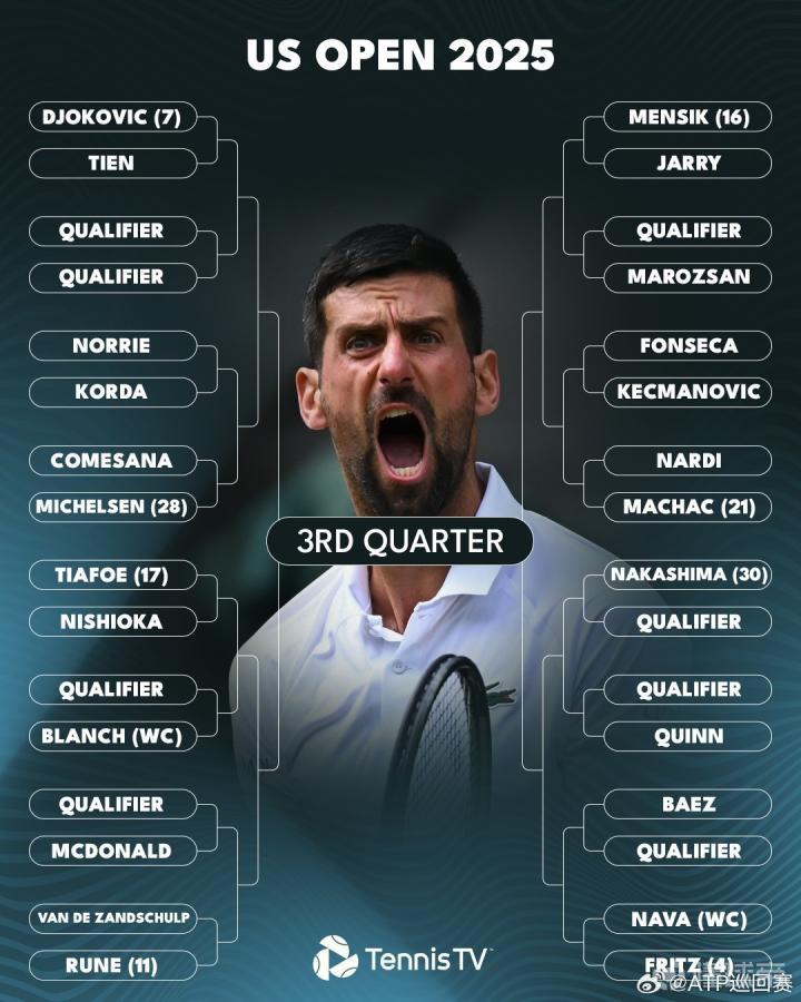 男单方面,1号种子辛纳和2号种子阿尔卡拉斯首轮将分别面对科普利瓦和奥佩尔卡,德约作为7号种子出战,首轮面对本土新星勒纳-钱。