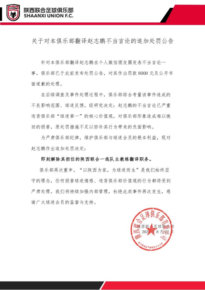 8月22日晚,陕西联合足球俱乐部官方发布公告,对该俱乐部的翻译员赵志鹏解除职务。