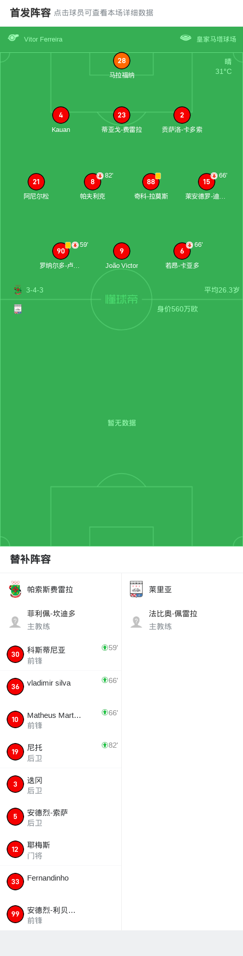 帕索斯费雷拉0-0莱里亚,双方互有攻守战报bot @懂球帝2025-08-23 23:01葡萄牙足球甲级联赛第三轮,帕索斯费雷拉坐镇主场迎战莱里亚。全场比赛双方均未能攻破对方球门,最终以0-0的比分握手言和。点击查看本场比赛详细数据>>点击查看葡甲完整积分榜>> 球队阵容 技术统计 展开更多