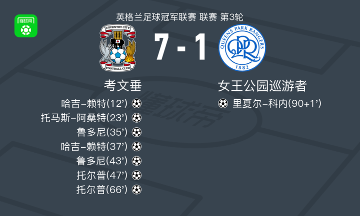 北京时间8月23日,英格兰足球冠军联赛第3轮,考文垂坐镇主场迎战女王公园巡游者。比赛中,考文垂多点开花,哈吉-赖特、托马斯-阿桑特、鲁多尼和托尔普均有进球入账,其中哈吉-赖特、鲁多尼与托尔普各自完成梅开二度,托马斯-阿桑特也贡献了一粒进球。女王公园巡游者方面,里夏尔-科内在比赛补时阶段打入挽回颜面的一球。最终,考文垂以7比1大胜女王公园巡游者。