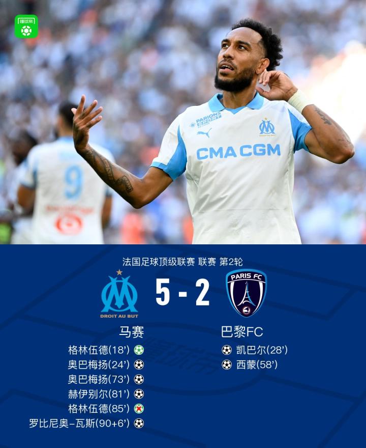 北京时间8月23日,法国足球顶级联赛第2轮,马赛坐镇主场迎战巴黎FC。上半场奥巴梅扬造点,格林伍德主罚命中,之后格林伍德开出角球,奥巴梅扬破门,随后凯巴尔禁区内精彩兜射破门扳回一球。下半场凯巴尔直塞,西蒙前插后单刀破门扳平比分,之后纳迪尔前场抢断,随后奥巴梅扬破门完成双响再度领先,随后纳迪尔做球,赫伊别尔精彩远射破门,比赛尾声瓦斯造点,格林伍德点球打偏,补时最后时刻格林伍德直塞,瓦斯小角度爆射破门。最终马赛5-2战胜巴黎FC。