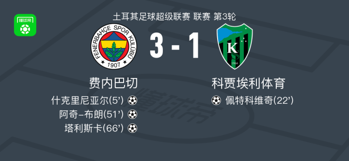 费内巴切3-1科贾埃利体育,塔利斯卡、阿奇-布朗破门