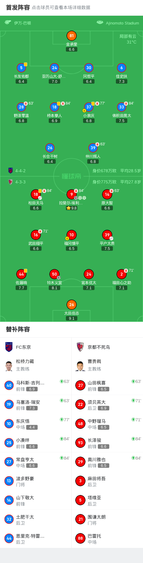 北京时间8月24日日本职业联赛J1 联赛 第27轮,FC东京主场对阵京都不死鸟。京都不死鸟拉斐尔-埃利亚斯帽子戏法,铃木义宜破门。最终比分FC东京 0-4 京都不死鸟。