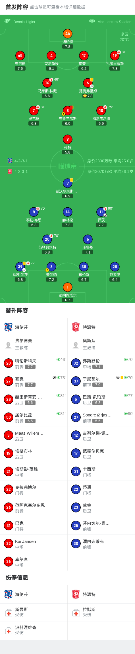 特温特2-1海伦芬,于尼瓦尔建功,罗茨破门