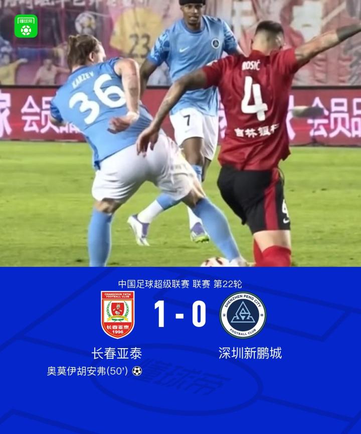 8月24日,中国足球超级联赛第22轮,长春亚泰坐镇主场迎战深圳新鹏城。比赛中,长春亚泰球员奥莫伊胡安弗接队友胡安-卡米洛助攻成功破门,打入全场唯一进球。最终,长春亚泰以1-0战胜深圳新鹏城,全取三分。
