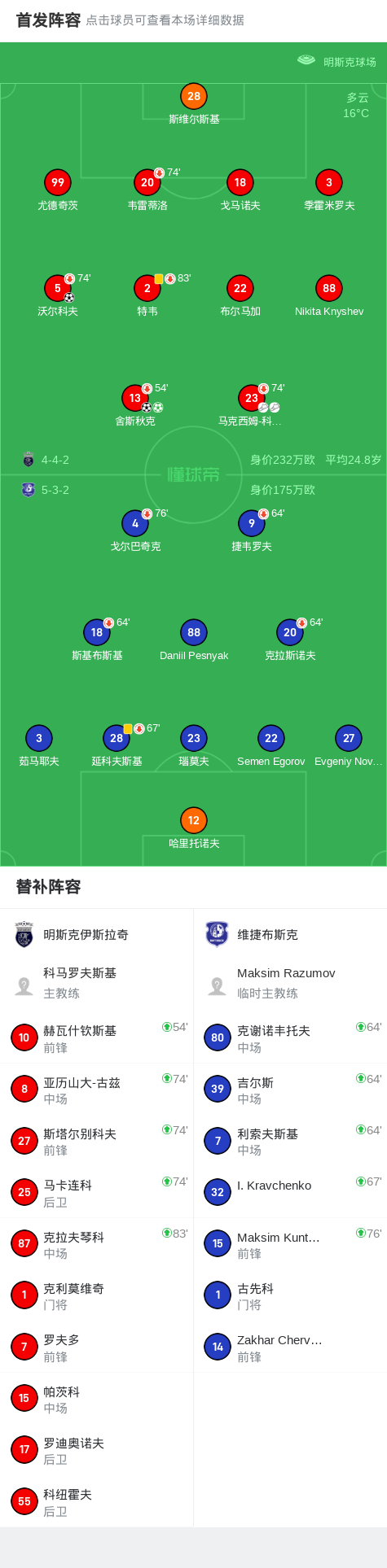 明斯克伊斯拉奇3-0大胜维捷布斯克,舍斯秋克双响,沃尔科夫破门