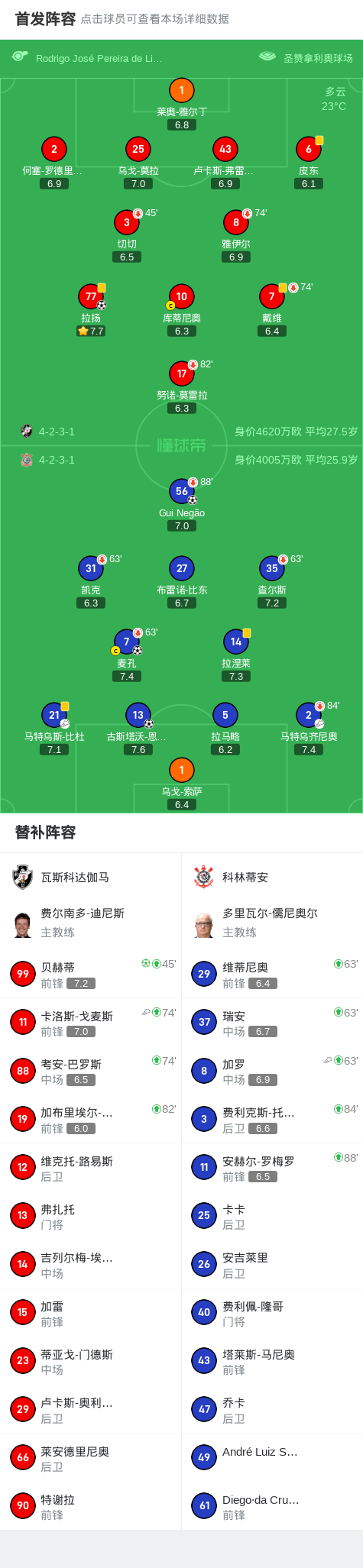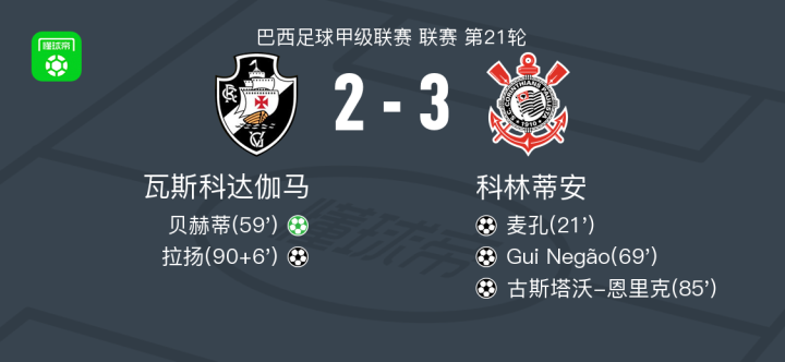 北京时间8月25日,巴西足球甲级联赛第21轮,瓦斯科达伽马坐镇主场迎战科林蒂安。比赛中,瓦斯科达伽马由贝赫蒂通过点球打破僵局,随后拉扬在下半场补时阶段打入一球。科林蒂安方面,麦孔、Gui Negão和古斯塔沃-恩里克分别取得进球。最终,科林蒂安以3比2战胜瓦斯科达伽马。