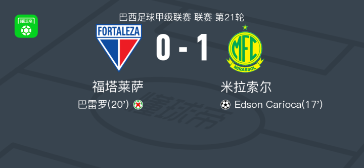 北京时间8月25日,巴西足球甲级联赛第21轮,福塔莱萨主场迎战米拉索尔。比赛中,米拉索尔球员Edson Carioca成功破门,为球队取得领先。此外,福塔莱萨球员巴雷罗在比赛中错失一次点球机会。最终,米拉索尔客场以1比0战胜福塔莱萨。