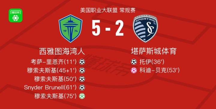 西雅图海湾人5-2大胜堪萨斯城体育,穆索夫斯基帽子戏法,Snyder Brunell破门