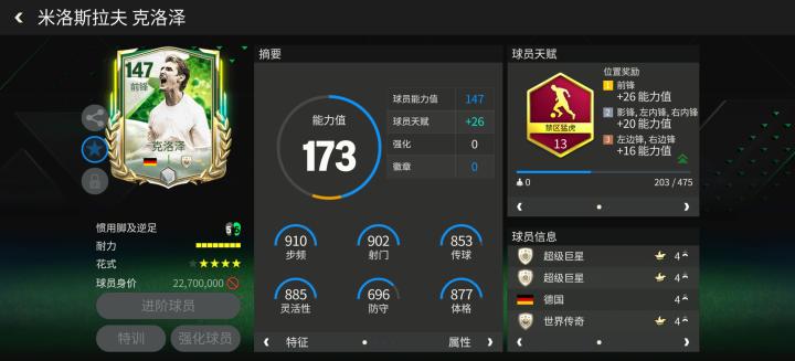 游戏中,草根英雄球员克洛泽配备了禁区猛虎天赋,花式方面,马赛回旋搭配四星花式星级的配置中规中矩,具备一定的持球进攻能力。