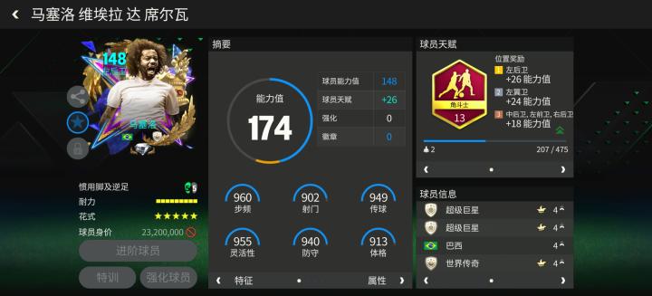 游戏中,草根英雄球员马塞洛配备了角斗士天赋,花式方面,高级油炸丸子搭配五星花式星级让他的边路突破更加犀利。