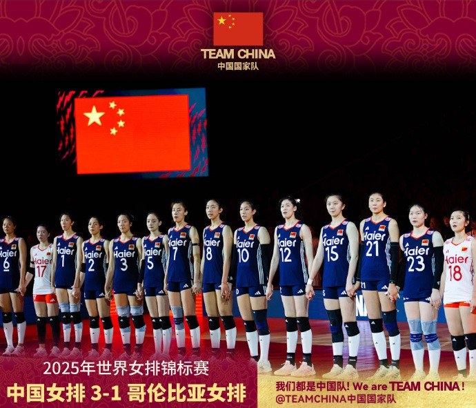 8月25日,2025年女排世锦赛小组赛,中国女排以3-1(25-16、23-25、25-14、25-16)战胜哥伦比亚女排,取得两连胜,提前晋级16强。8月27日20:30,中国女排将迎战多米尼加女排,胜者获得小组第一。