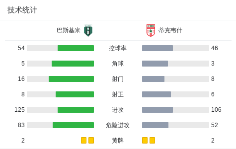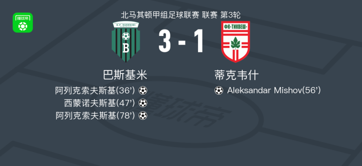 北京时间8月25日,北马其顿甲组足球联赛第3轮,巴斯基米坐镇主场迎战蒂克韦什。比赛中,巴斯基米由阿列克索夫斯基率先破门,随后西蒙诺夫斯基扩大比分,蒂克韦什由Aleksandar Mishov扳回一城,比赛尾声阶段,阿列克索夫斯基再入一球完成梅开二度。最终,巴斯基米以3比1战胜蒂克韦什。