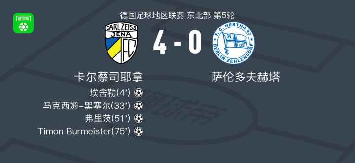 卡尔蔡司耶拿4-0大胜萨伦多夫赫塔,Timon Burmeister建功,弗里茨破门