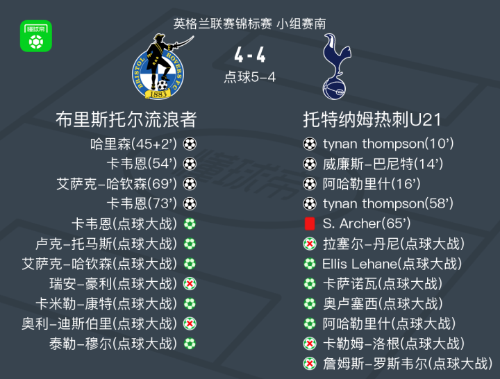 北京时间8月27日英格兰联赛锦标赛 小组赛南,布里斯托尔流浪者对阵托特纳姆热刺U21。布里斯托尔流浪者哈里森破门,卡韦恩梅开二度,艾萨克-哈钦森破门。托特纳姆热刺U21tynan thompson梅开二度,威廉斯-巴尼特破门,阿哈勒里什破门。最终比分布里斯托尔流浪者 9-8 托特纳姆热刺U21。