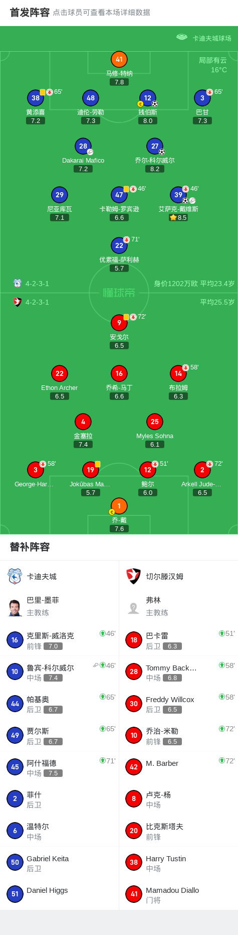 第11分钟,卡迪夫城球员Dakarai Mafico助攻艾萨克-戴维斯打入一球。