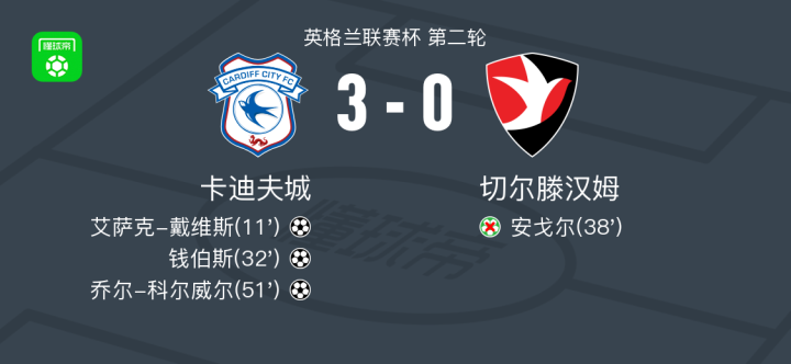 北京时间8月27日英格兰联赛杯 第二轮,卡迪夫城对阵切尔滕汉姆。卡迪夫城艾萨克-戴维斯破门,钱伯斯破门,乔尔-科尔威尔破门。最终比分卡迪夫城 3-0 切尔滕汉姆。