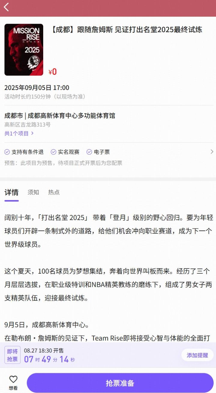 拼手速,官方:詹姆斯中国行成都站预约通道今晚6点半开启蓝司机学姐 @懂球帝2025-08-27 10:45北京时间8月27日,耐克官方消息,詹姆斯中国行成都站预约通道将于今晚18点30分正式开启。9月5日,詹姆斯将在成都高新体育中心多功能体育馆参与打出名堂2025终局之战的比赛。“票星球”小程序及App将在今晚18点30分开启免费预约门票通道。展开更多