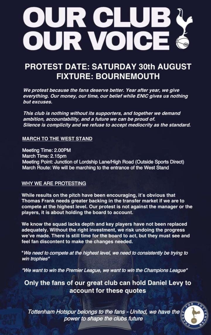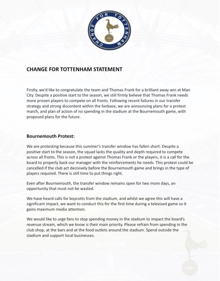 北京时间8月27日,由于不满俱乐部在今年夏季转会窗口中的引援表现,热刺球迷组织Change For Tottenham发布声明,呼吁球迷在下一轮英超比赛中进行抗议活动。