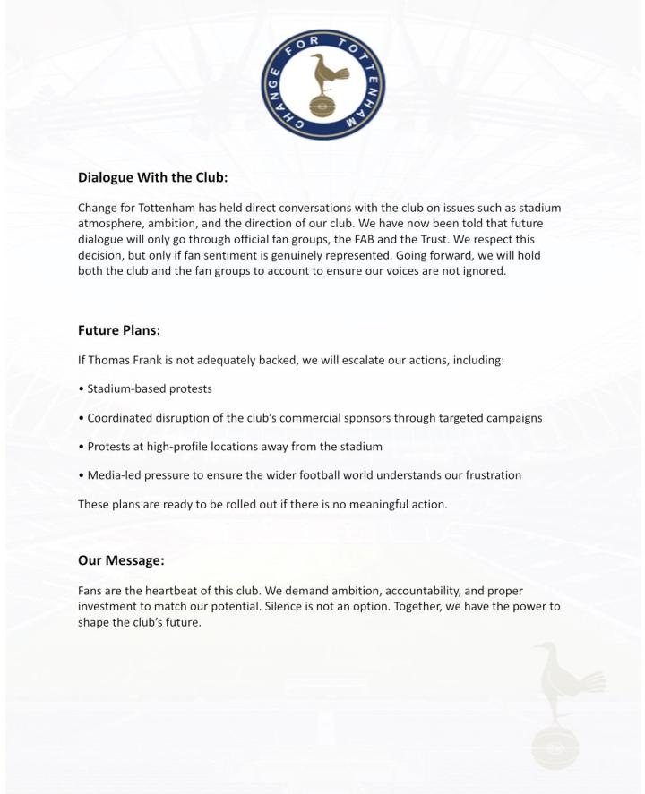 “Change For Tottenham”组织此前已就球场氛围、俱乐部目标及发展方向等核心问题,与俱乐部进行过直接对话。目前我们接到通知,未来此类对话将只能通过官方球迷组织(FAB和信托)进行。