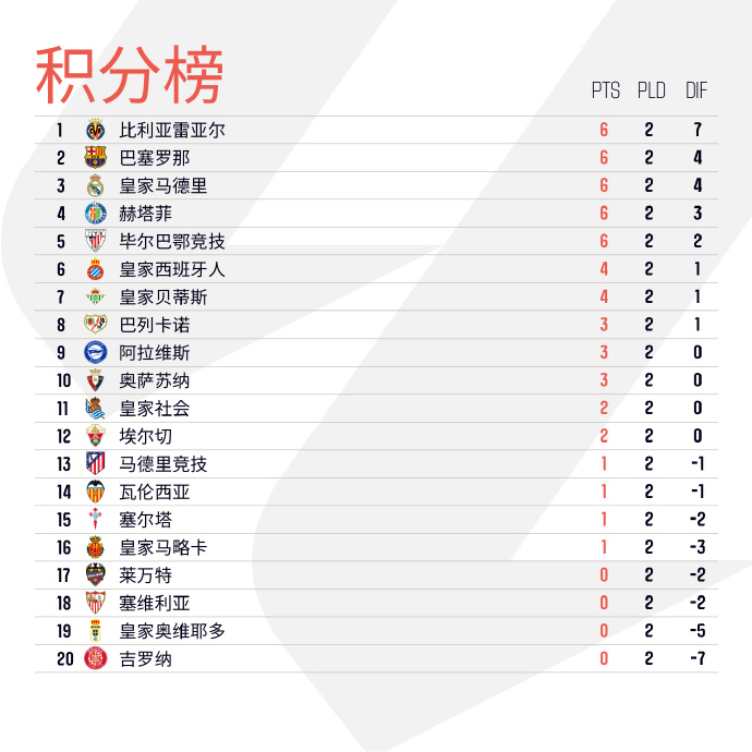 除此之外,本赛季拥有欧冠资格的比利亚雷亚尔在主场5比0大胜赫罗纳,球队开赛两轮打进7球并且一球未丢稳坐榜首。毕尔巴鄂竞技则是主场1比0小胜同样拿到两连胜。