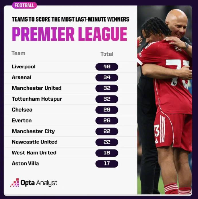 根据Opta Analyst的统计,利物浦是英超...蹴鞠总动员 @懂球帝2025-08-27 15:19根据Opta Analyst的统计,利物浦是英超联赛历史上在最后一分钟取得绝杀进球最多的球队: 1、利物浦——46次 2、阿森纳——34次 3、曼联——32次 4、托特纳姆热刺——32次 5、切尔西——29次 6、埃弗顿——26次 7、曼城——22次 8、纽卡斯尔联——22次 9、西汉姆联——18次 10、阿斯顿维拉——17次展开更多