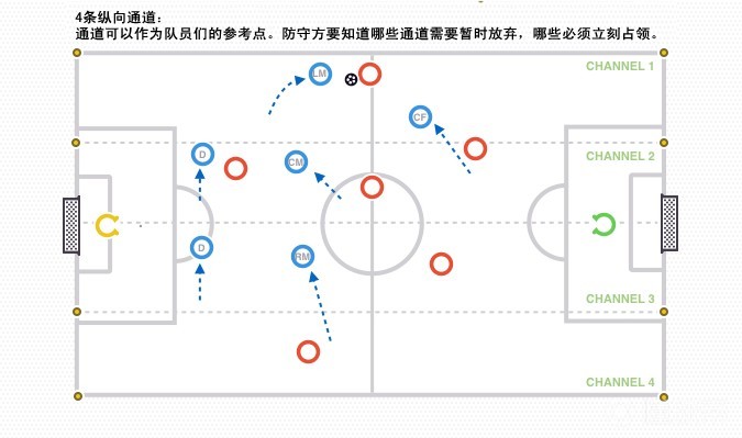 同样地,通道可以作为队员们的参考点。防守方要知道哪些通道需要暂时放弃,哪些必须立刻占领。因为足球是一项对抗性的比赛,所以防守队员在场上要随着球不断转移。