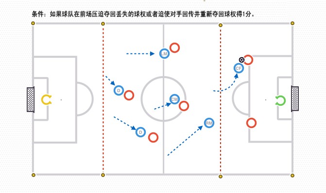 比如,中场球员在中场丢球,球队实施压迫在中场夺回球权,得1分;如果他们站好位置,迫使对手回传,然后在对手后场夺回球权,也得1分。