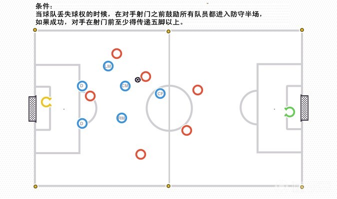 当球队丢失球权的时候,在对手射门之前让所有队员都进入防守半场,如果成功,对手在射门前至少得传递五脚以上。