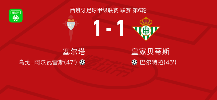 塞尔塔1-1皇家贝蒂斯,巴尔特拉先拔头筹,乌戈-阿尔瓦雷斯扳平比分