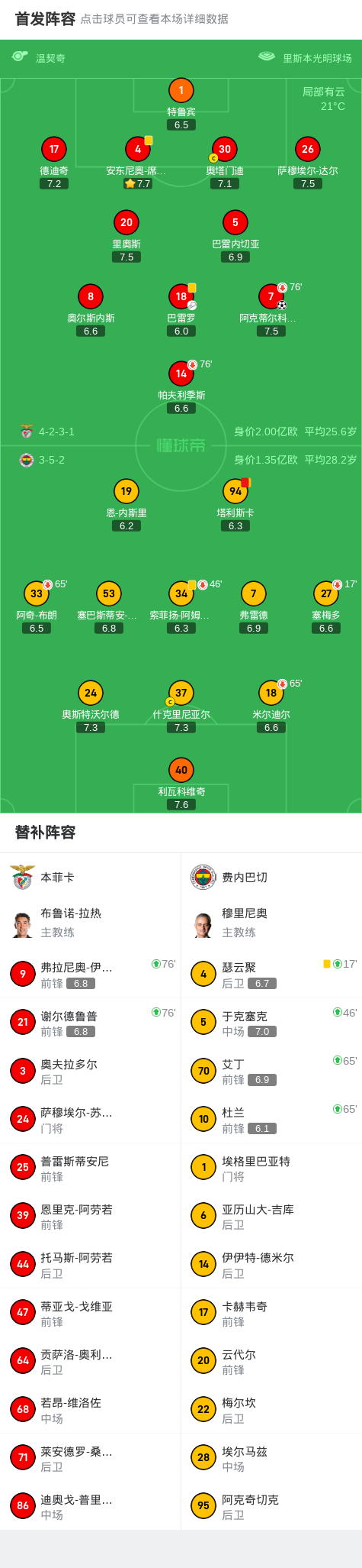 本菲卡1-0费内巴切,阿克蒂尔科奥卢制胜,塔利斯卡染红