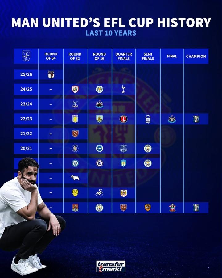 本赛季在阿莫林的带领下,曼联英联杯第二轮面对英乙球队格林斯比,点球大战以11-12惨遭淘汰,是他们近10年来在该项赛事的最早的一次出局。