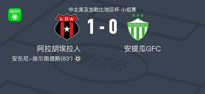 北京时间8月28日中北美及加勒比地区杯 小组赛,阿拉胡埃拉人对阵安提瓜GFC。阿拉胡埃拉人安东尼-埃尔南德斯破门。最终比分阿拉胡埃拉人 1-0 安提瓜GFC。