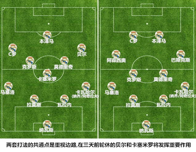 尽管由巴斯克斯和阿森西奥担任两翼的平行442拥有惊人的实战威力,但让齐达内在如此关键的比赛中放弃健康的BBC成员显然是不可想象的。毫不夸张的是,对阵巴黎的180分钟比赛对齐达内、BBC成员以及典礼阵容的其他成员来说,都是事关职业生涯发展的决定性战役。皇马方面最大的疑问就是如何在卡瓦哈尔缺席首回合的情况重组右路进攻,鉴于小将阿什拉夫在前期代班时的表现不够理想,纳乔出现在右闸的可能性很大。在三天前对阵皇家社会的比赛中,首发表现出色的巴斯克斯成为了第一个被换下的球员,这让部分西班牙媒体开始猜测齐达内可能会安排巴斯克斯&纳乔的右翼组合来协防内马尔,伤愈复出后连打9场比赛的贝尔继续作为替补出场。