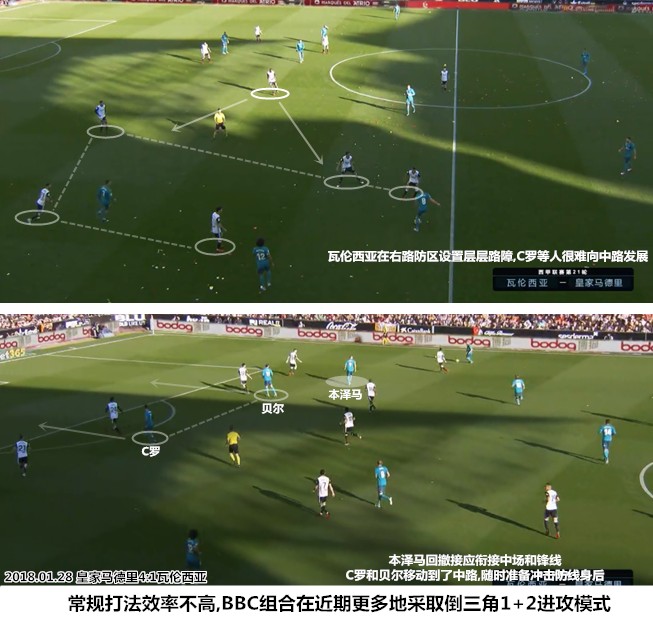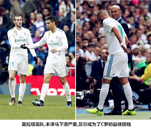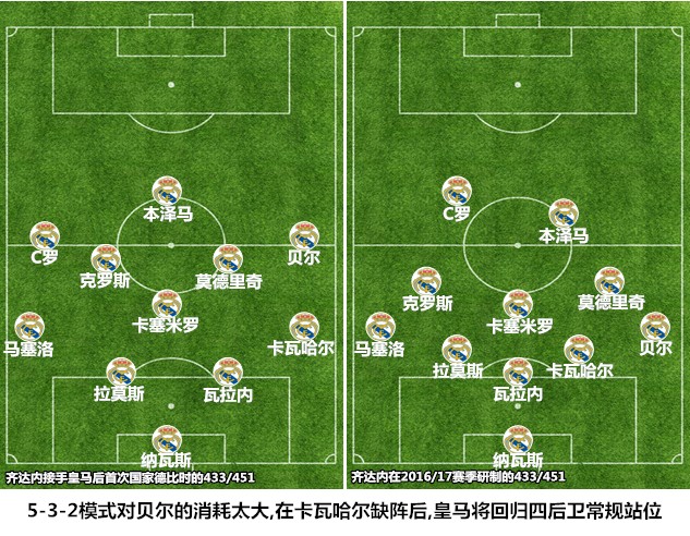 从BBC组合合体后的几场比赛来看,一人拉边配合边后卫和进攻型中场打通边路,两人伏于禁区等待传中的传统作战模式,已经不适合现阶段的BBC组合。为了弥补“两亿”外围杀伤力不足的缺陷,齐达内安排本泽马更多地回撤衔接中场的锋线,C罗和贝尔内收到肋部寻觅冲击身后的机会,这种433体系下的锋线倒三角站位模式与菱形442有很多相似之处。