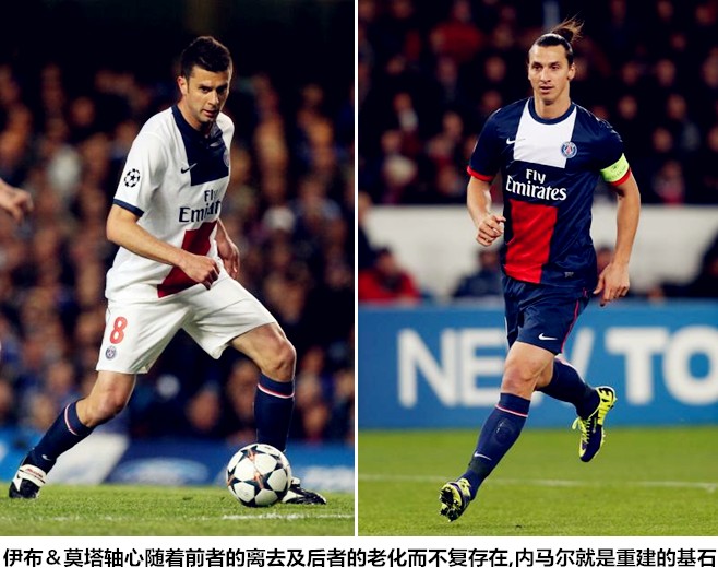 在安切洛蒂和布兰科时代,巴黎圣日耳曼形成了以伊布&莫塔为前后轴心的控球战术,两人身材高大但技术极为细腻的球员占据两个禁区弧顶附近。在整体实力偏弱且极少有球员可以熟练掌握高位压迫战术的法甲,莫塔在防线身前可以轻松地完成攻守转换和进攻推进任务,伊布强大的禁区存在感足以保证大巴黎在面对联赛对手时的碾压。不过,受限于整体跑动能力不足、前场球权流向过于单一以及拼图型球员在功能上的缺陷,这套阵容始终无法突破欧冠八强的天花板。