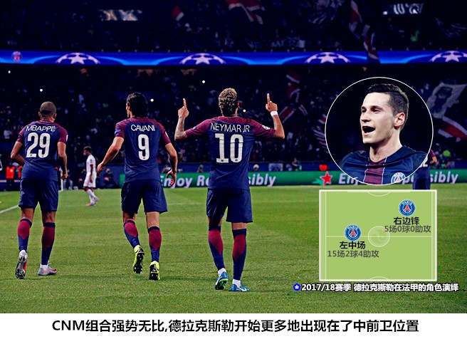 然而,从上赛季的情况来看,迪马利亚的纵向突击能力出现了比较明显的衰退,阿根廷人开始承担起了更多的肋部策应和传中任务,这让他和另一侧的德拉克斯勒出现了风格上的趋同。巴黎的两翼看似拥有两位优秀边锋,但实际上还是要依靠大兵团作战,在没有出色的拦截型后腰的情况下很容易被对手偷袭身后。作为迪马利亚和德拉克斯勒的高端升级品,内马尔和姆巴佩的到来很快让人们见识到了强大的个人能力对体系的加成作用。