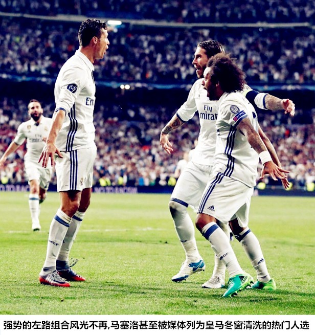 当然,从过往的比赛中我们不难发现,由于脚下技术和连续传切能力都不够细腻,贝尔和卡瓦哈尔(包括纳乔)之间的配合远不如C罗和马塞洛默契。仅靠这两名球员的配合是不足打破对手重兵布防的左路防区,必须依靠中锋(本泽马)的拉边和进攻型中场(莫德里奇)的支援,才能在强侧形成有效渗透。不过,依靠右路反制也会带来左路的问题,就是马塞洛必须留在相对靠后的位置或内收中路防止对手反击,这在皇马现阶段偏重于左倾化的战术体系中是无法想象的。皇马现阶段的左路已经失去了往日的荣光,C罗的转型以及马塞洛、拉莫斯的退步令强势的组合风光不再,中前场的持续窄化也放大了克罗斯的弱点,皇马左路防区遭遇对手围攻而狼狈不堪的画面已屡见不鲜。