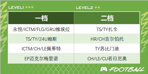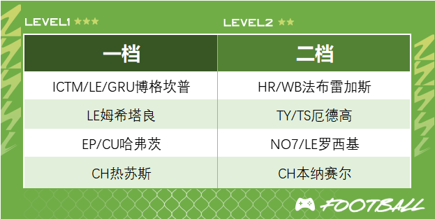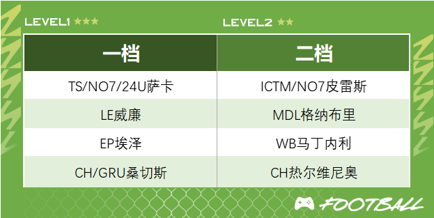 和之前介绍的曼联套如出一辙,阿森纳套在中场位置的选择面也同样较少,而且同质化严重,几乎是清一色的3逆足防守型中场,缺少能够推进和前插禁区内做文章的全能球员。相比之下,维埃拉依然是最为稳定的选择,GRU赛季4逆在出球上更有优势,其他赛季的接球转身速率也不算慢,而且他的对抗在游戏里是数一数二的,经常能做出防守动画。另外一位中场位置更推荐赖斯,赖斯的新卡速率提升很大,能够偶尔进行盘带突破,右脚抽射反角的远射也有惊喜。本赛季新加盟的苏比门迪目前还没有非常亮眼的赛季卡,不过这名球员的底子不错,属于技术流双五脚中场,如果未来的新卡能够加强对抗和速率,很有希望占据阿森纳套的主力。