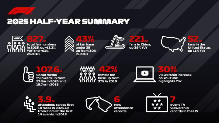 全球粉丝数量使一级方程式成为全球最受欢迎的体育联盟,其粉丝规模比排名第二的体育联盟(NBA)高出11.4%。