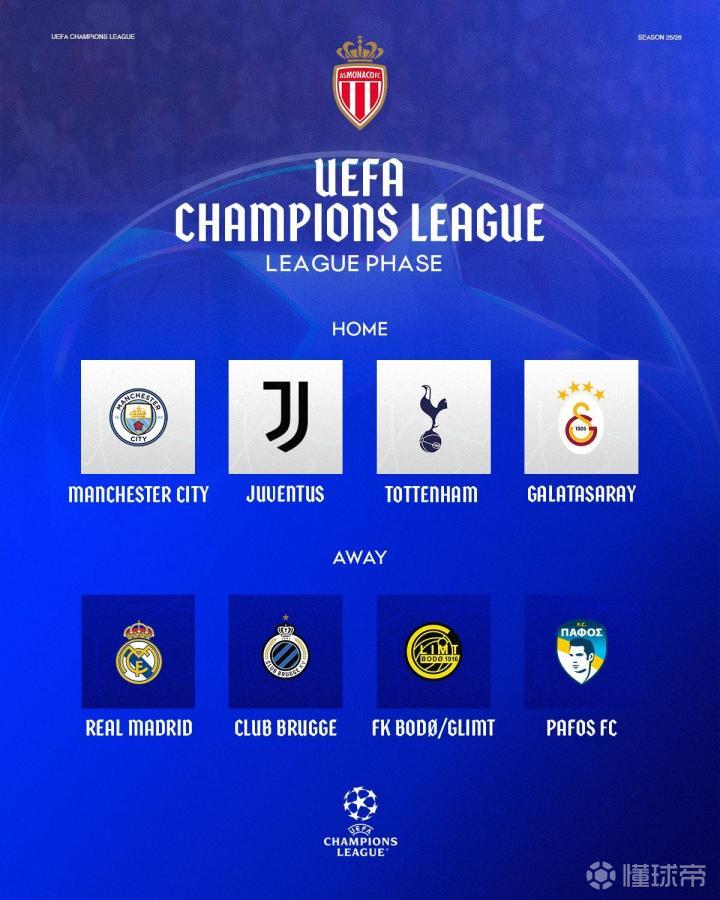 摩纳哥欧冠对手出炉:主场对阵曼城、尤文、热刺,客场战皇马