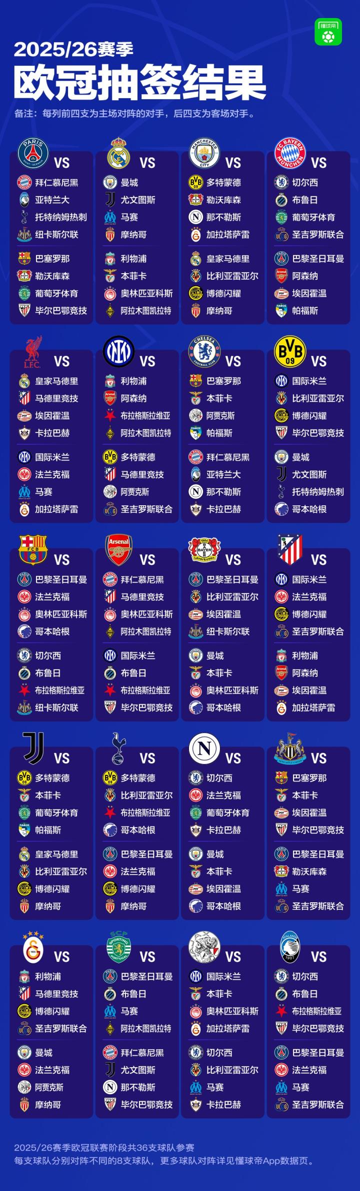 2025-26赛季欧冠联赛阶段对阵出炉!