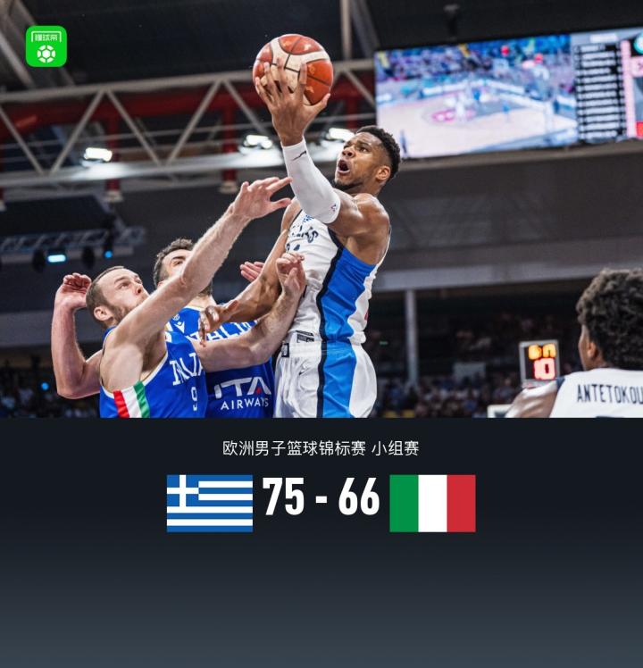 第四节希腊男篮字母哥拿下8分,意大利男篮萨利乌-尼昂拿下7分,最终希腊男篮75-66战胜意大利男篮