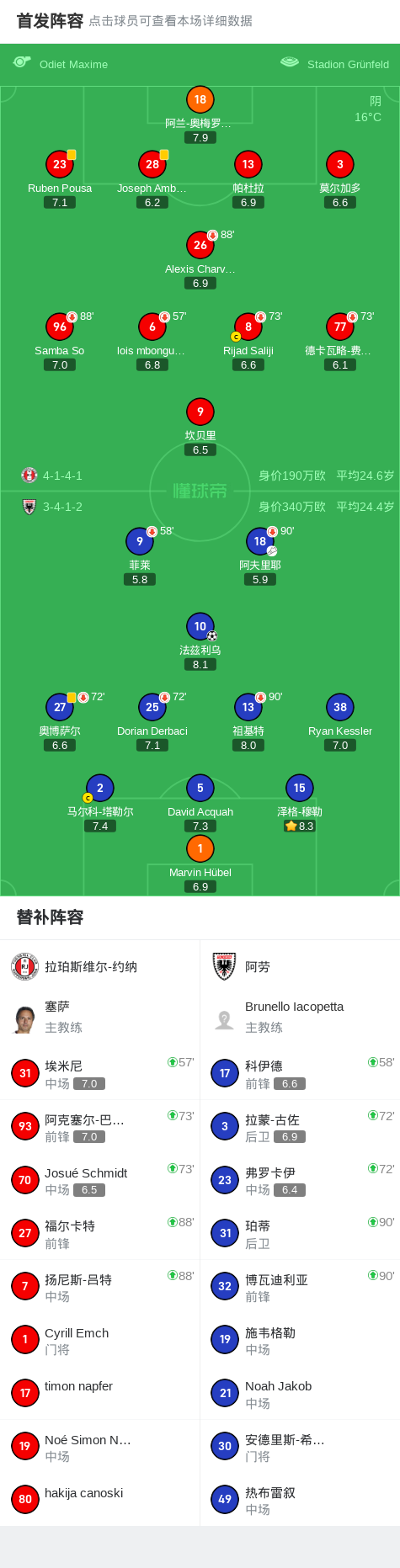 阿劳1-0拉珀斯维尔-约纳,法兹利乌制胜战报bot @懂球帝2025-08-30 04:118月30日,瑞士足球挑战联赛第6轮,拉珀斯维尔-约纳主场迎战阿劳。比赛中,阿夫里耶送出助攻,帮助法兹利乌完成破门。最终,阿劳以1-0的比分客场取胜,全取三分。点击查看本场比赛详细数据>>精彩瞬间第62分钟,阿劳球员阿夫里耶助攻法兹利乌打入一球。 球队阵容 技术统计 展开更多