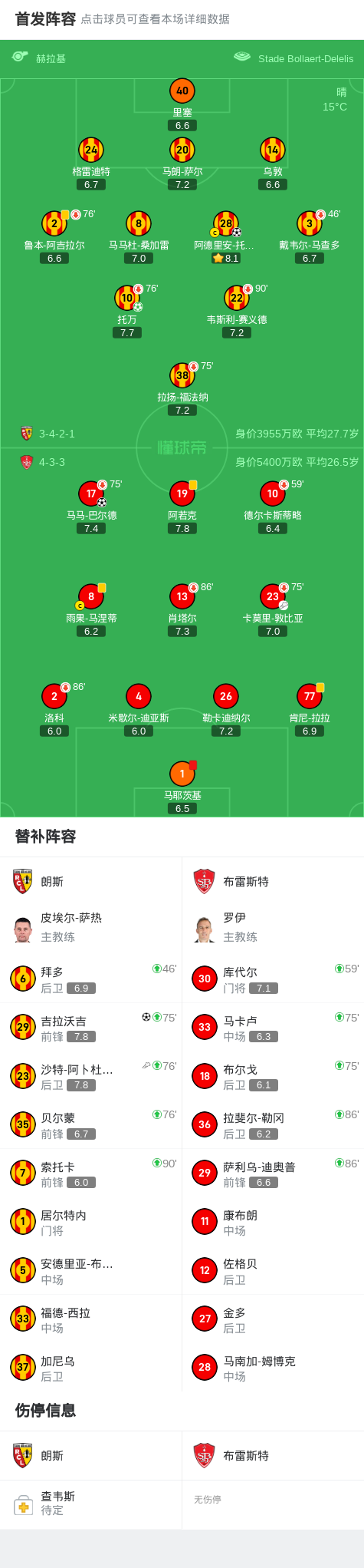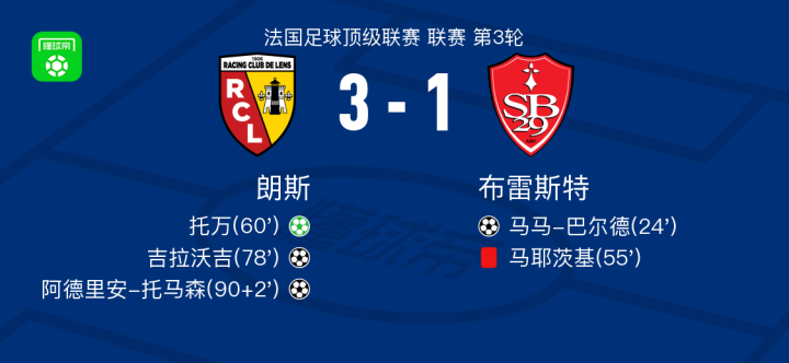 北京时间8月30日法国足球顶级联赛 联赛 第3轮,朗斯主场对阵布雷斯特。朗斯托万破门,吉拉沃吉破门,阿德里安-托马森破门。布雷斯特马马-巴尔德破门。最终比分朗斯 3-1 布雷斯特。