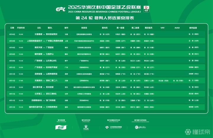 北京时间8月30日,中国足球乙级联赛第24轮裁判名单公布,耿茂翔执法无锡vs深圳,杨春雨吹广西vs山东。